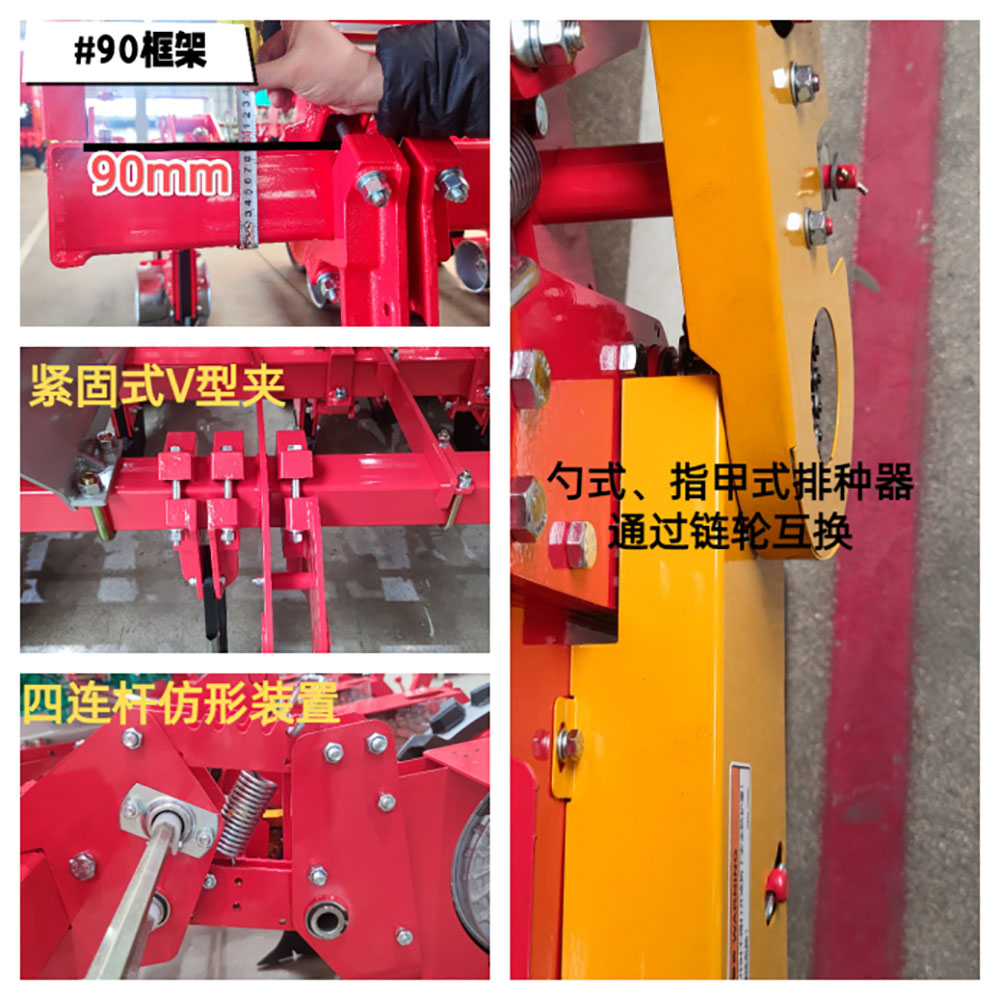 本機(jī)具是一款多功能高效專業(yè)播種玉米機(jī)械, 采用加強(qiáng)型開(kāi)溝犁體,指夾和勺輪式兩選的精量排種器, 可一次性完成 開(kāi)溝 、施肥 、播種 、覆土 、鎮(zhèn)壓等工序 。