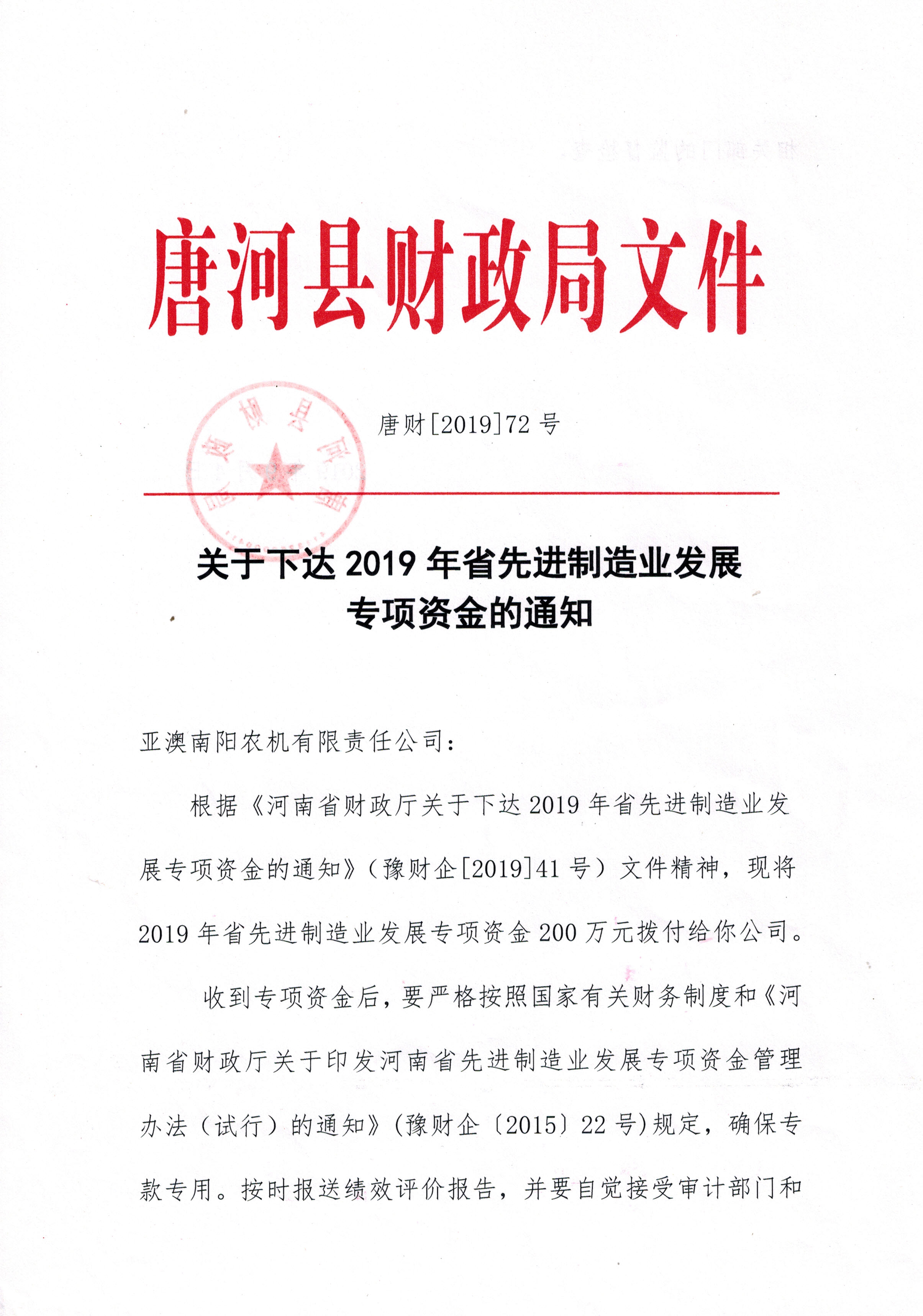 近日,國(guó)家工信部下達(dá),河南省政府《印發(fā)<關(guān)于下達(dá)2019年省先進(jìn)制造業(yè)發(fā)展專項(xiàng)獎(jiǎng)金的通知》,對(duì)獲得先進(jìn)制造業(yè)--國(guó)家綠色工廠的南陽市唐河縣亞澳南陽農(nóng)機(jī)有限責(zé)任公司的扶持專項(xiàng)資金200萬元下?lián)堋?/span>